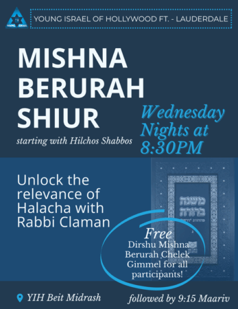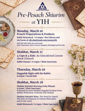 7:30–8:00 AM (Mon–Fri) — Amud HaYomi – Masechta Pesachim w/ Rabbi Claman(Chapel)