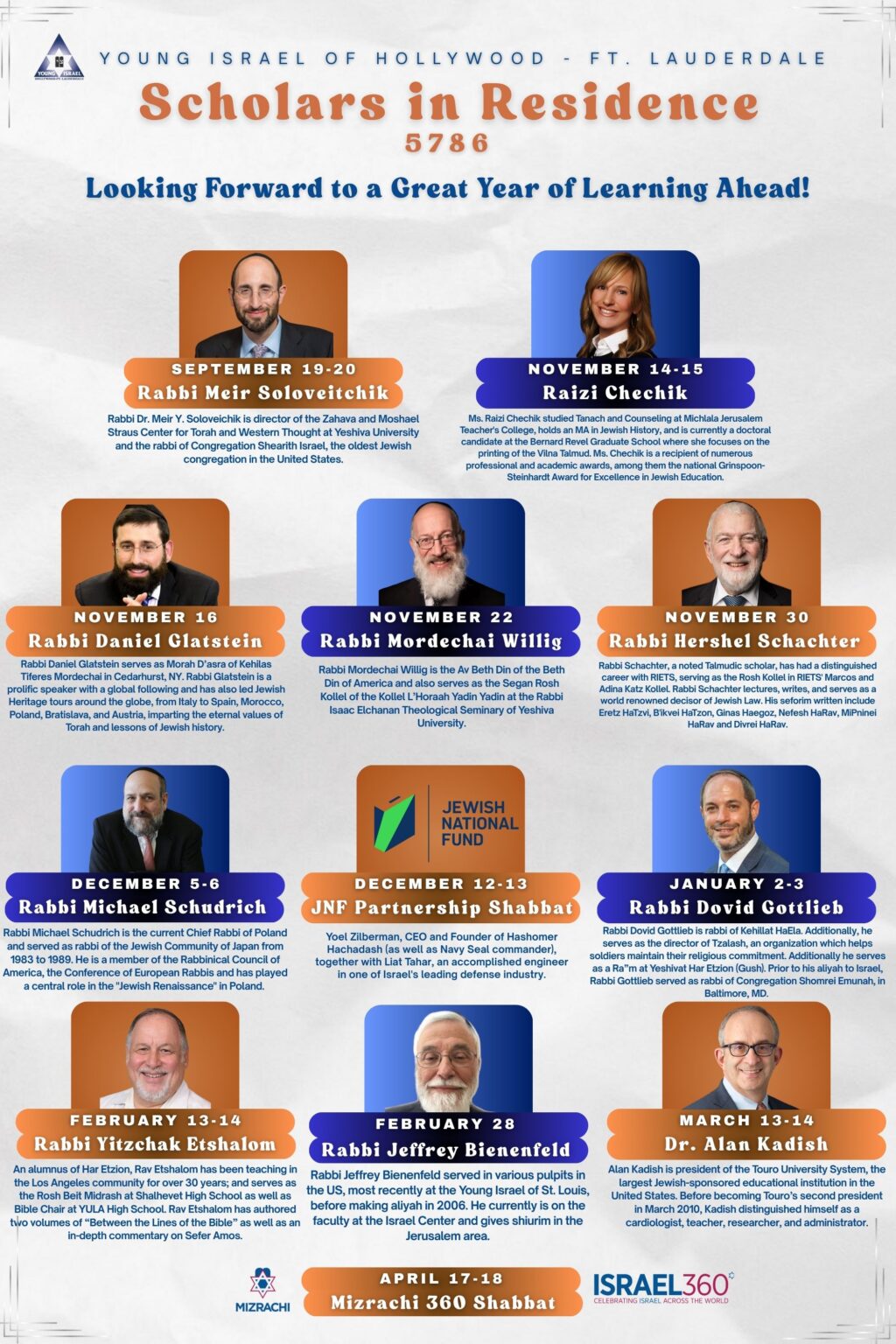 Renowned scholars and guest speakers spend a Shabbat at YIH to engage and inspire members with a variety of lectures and classes throughout the weekend. Topics range from Tanach and Israeli politics to Jewish History and contemporary Jewish issues.